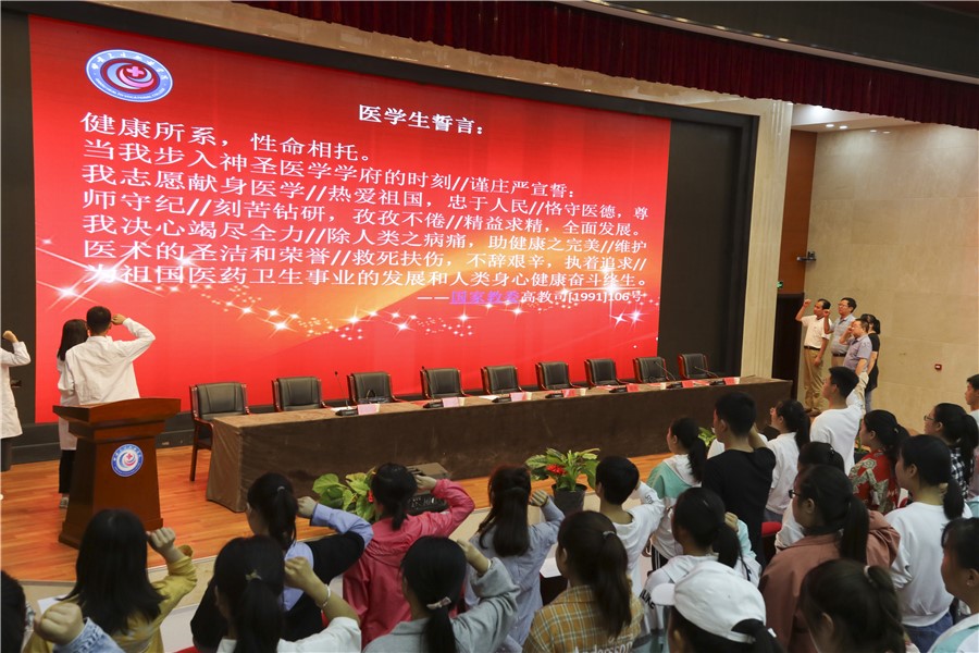 会议第一阶段举行了欢迎2019级新生大会。全体参会人员齐唱国歌,大会在热烈而又庄严的氛围中拉开序幕。紧接着,学院院长张志钢发表了热情洋溢的欢迎词,他首先代表学院向新同学表示热烈的欢迎和诚挚的感谢,感谢同学们选择威廉希尔中文网站作为人生的新起点。随后,他满含深情的介绍了学校的建设发展历史和现状,指出同学们的选择将是人生的一次最正确的选择,语重心长地送同学们三句话、做三种人与之共勉:一是不忘求学初心,做一名品格高尚、品质高贵、品味高雅的大学人;二是牢记与践行“勤奋 自强 厚德 博学”的校训,做一名德才兼备的卫院人;三是立志乐学强身,做一名品学兼优的合格接班人。接着,新生代表郑海霞在发言时说,新生报到的这几天,她感受到了校园朝气蓬勃的气氛,热情友好的老师与同学使她感受到了家的温暖,她一定不负年华,努力学习,做一名合格的大学生。在校生代表张萌萌在发言时说,她无悔来威廉希尔中文网站就读的决定,鼓励新生积极进取,编织自己彩色的梦想,绘就自己彩色的年华。教师代表范丽娟、吕俊宏在发言时鼓励新生努力学习,掌握报效国家的本领,做一名有理想、有道德、有扎实医学技能的社会主建设者。接着,由学院党总支副书记郭艳玲领誓,全体与会师生进行医学生誓词宣誓活动,庄严神圣的医学誓言、有力豪迈的宣誓语音,久久回响在会场,震荡穿透着每一位在场师生心灵,给每一位献身神圣医学的新生心头刻下了永远难忘的烙印,激励着未来的医学人牢记医者使命,在医学之路上执着追求、奋斗终生。