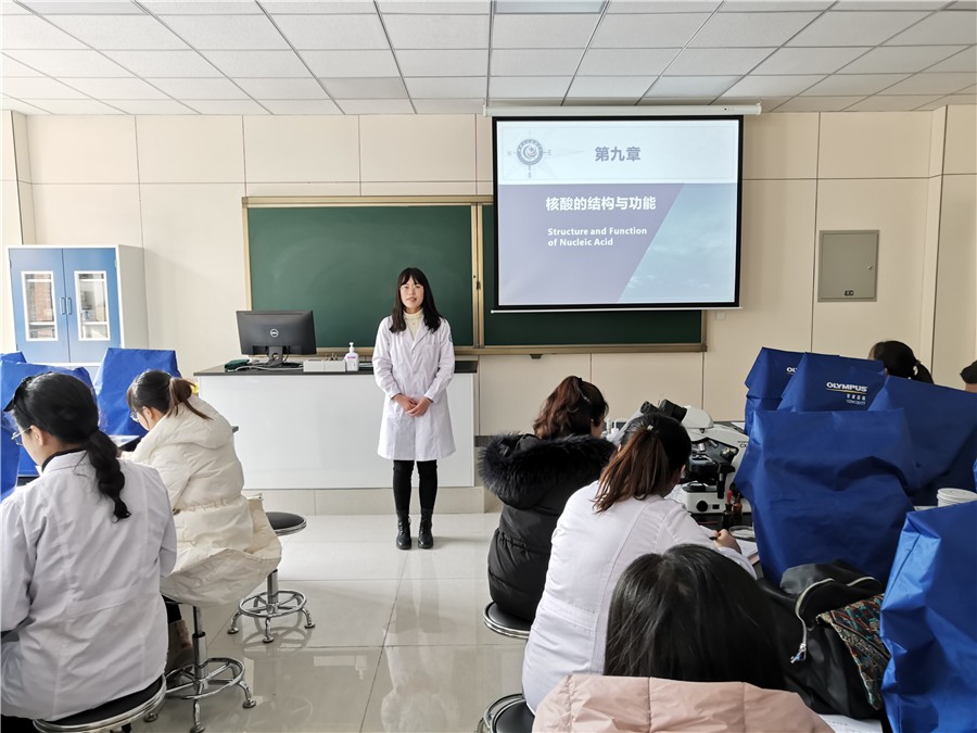 首先由新任课教师安盼盼、孙妍进行试讲活动。试讲课程为《生物化学》,内容为核酸的分子组成。两位老师结合自己新学期授课课程,利用板书结合PPT的方式分别进行了20分钟的教学展示。试讲结束后,评委老师们进行了评课,一致认为两位老师在课前准备充分,熟悉教学内容,教学过程中精神饱满、教态亲切、语言生动、条理比较清晰,课堂气氛活跃,基本可以胜任新学期教学任务,同时,也针对授课中的不足提出了中肯的意见和建议。