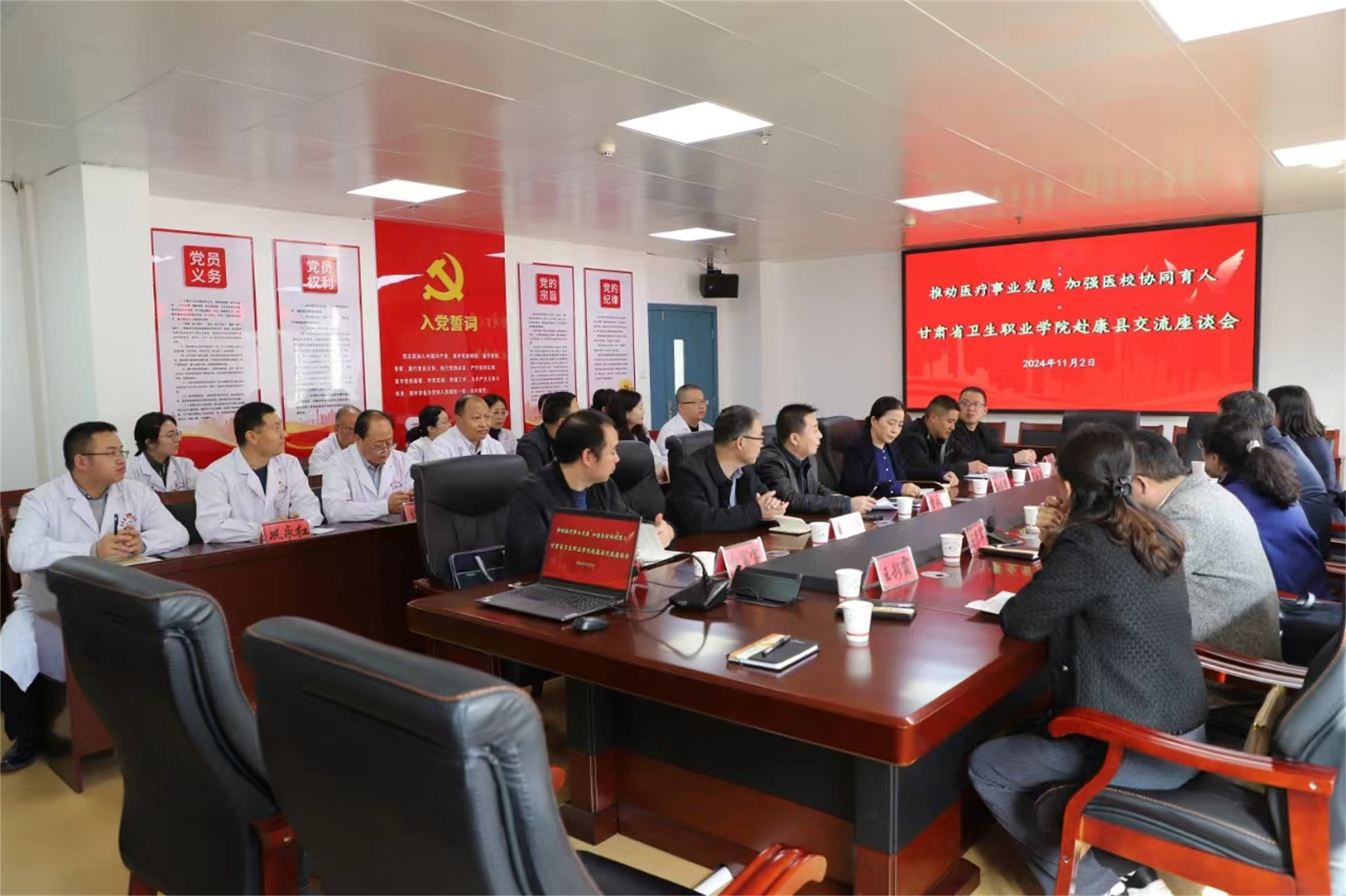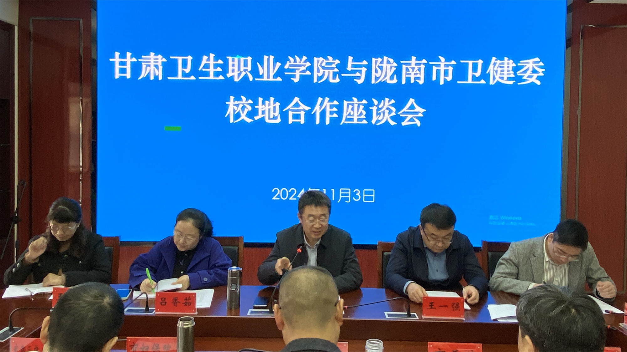 王建成一行在陇南市卫健委与武都区各医院及基层医疗机构举行座谈(陇南市卫健委党组成员、副主任王应虎,陇南市第一人民医院党委委员宋凯,陇南市妇幼保健院副院长焦文学、陇南市卫生学校党委书记管宏出席座谈会),认真听取了各医院及基层医疗机构对于医药卫生人才需求、人才培养等方面意见和建议。介绍了近两年改革发展情况,在人才培养方面独特的优势,从学生假期见习、教学资源共享、村医考核培训、护理员资格考核、实习就业基地共建五个方面表达了推进校地合作、校企合作,实现优势互补,互惠双赢的良好愿望,经友好沟通,双方决定在现有良好合作基础上,进一步加大合作力度,拓展合作领域,双方代表签订战略合作框架协议,标志着学校与校地、校企合作迈入了一个新阶段。