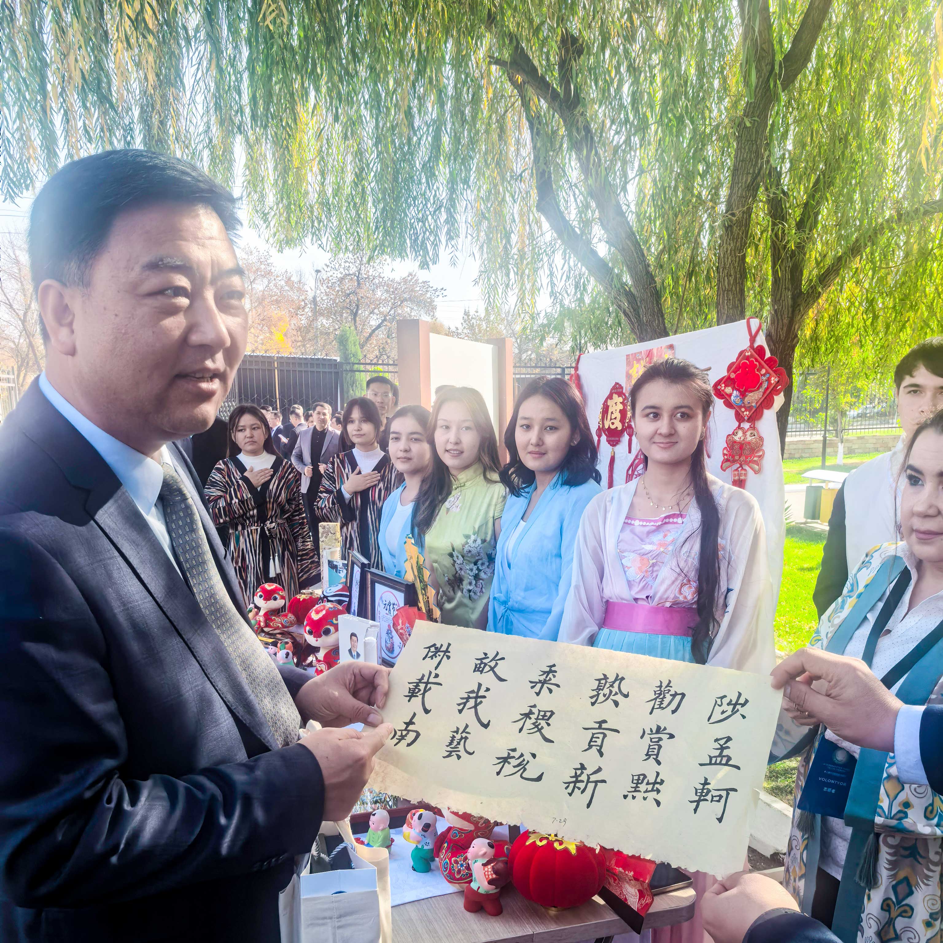 在统一组织的乌兹别克斯坦国立世界语言大学参观考察中,与该校汉语学专业学生围绕中国书法艺术进行了现场交流,对学生作品作了点评和鼓励,为伊尔霍姆琼•图克斯塔西诺夫校长现场题赠了“与德为邻”书法作品,以笔墨传递深情厚谊,展现了中国传统文化魅力。