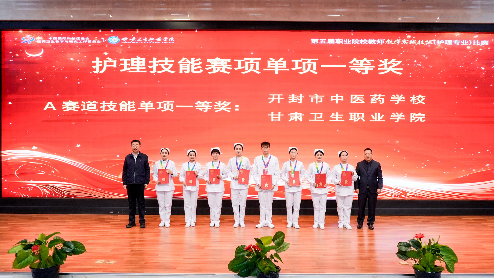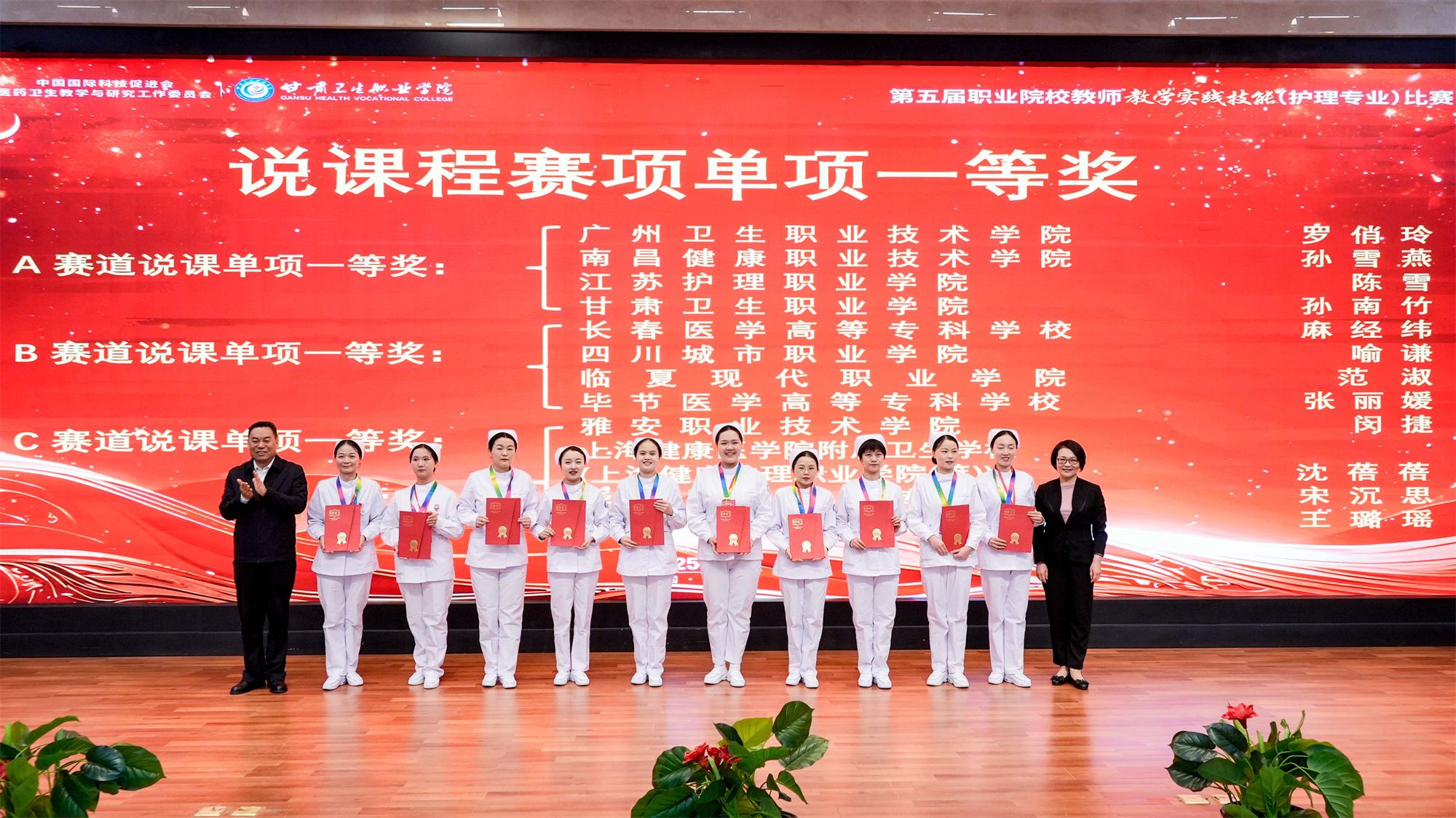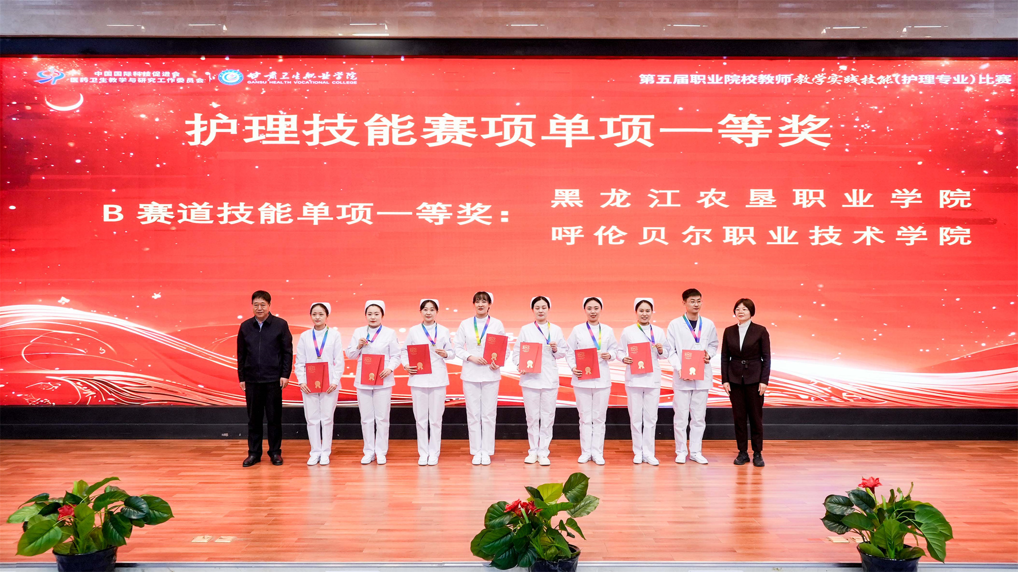 包磊书记致闭幕词,代表威廉希尔中文网站全体师生,向关心支持本届大赛顺利举办的中国职业技术教育学会、中国国际科技促进会医药卫生教学与研究工作委员会、甘肃省教育厅、甘肃省卫生健康委员会和其他社会各界人士表示最诚挚的感谢,向莅临闭幕式的各位领导、嘉宾表示最热烈的欢迎,向为赛事倾注心血的裁判团队、工作人员致以最诚挚的敬意,向在比赛中取得优异成绩的个人和团体表示最真心的祝贺,向参与赛事的全体选手和指导教师致以最真挚的问候。他表示,此次赛事不仅是技能的比拼,更是一次深刻的教育启示,期待与全国兄弟院校携手,共同破解医药卫生职业教育的痛点难点,在课程建设、教材开发、实训基地共建等领域开展更深层次的合作交流,让医药卫生职业教育更好地服务“健康中国”战略。同时希望各位参赛教师带着赛事中的所思所悟,回到工作岗位后继续发挥“种子教师”的辐射作用,带动更多同仁深耕教学一线,让“敬佑生命、救死扶伤” 的职业精神在课堂上传递,让“精益求精、追求卓越”的工匠精神在实训中传承,为助力职业教育发展,不断提高职业教育人才培养质量作出应有贡献。