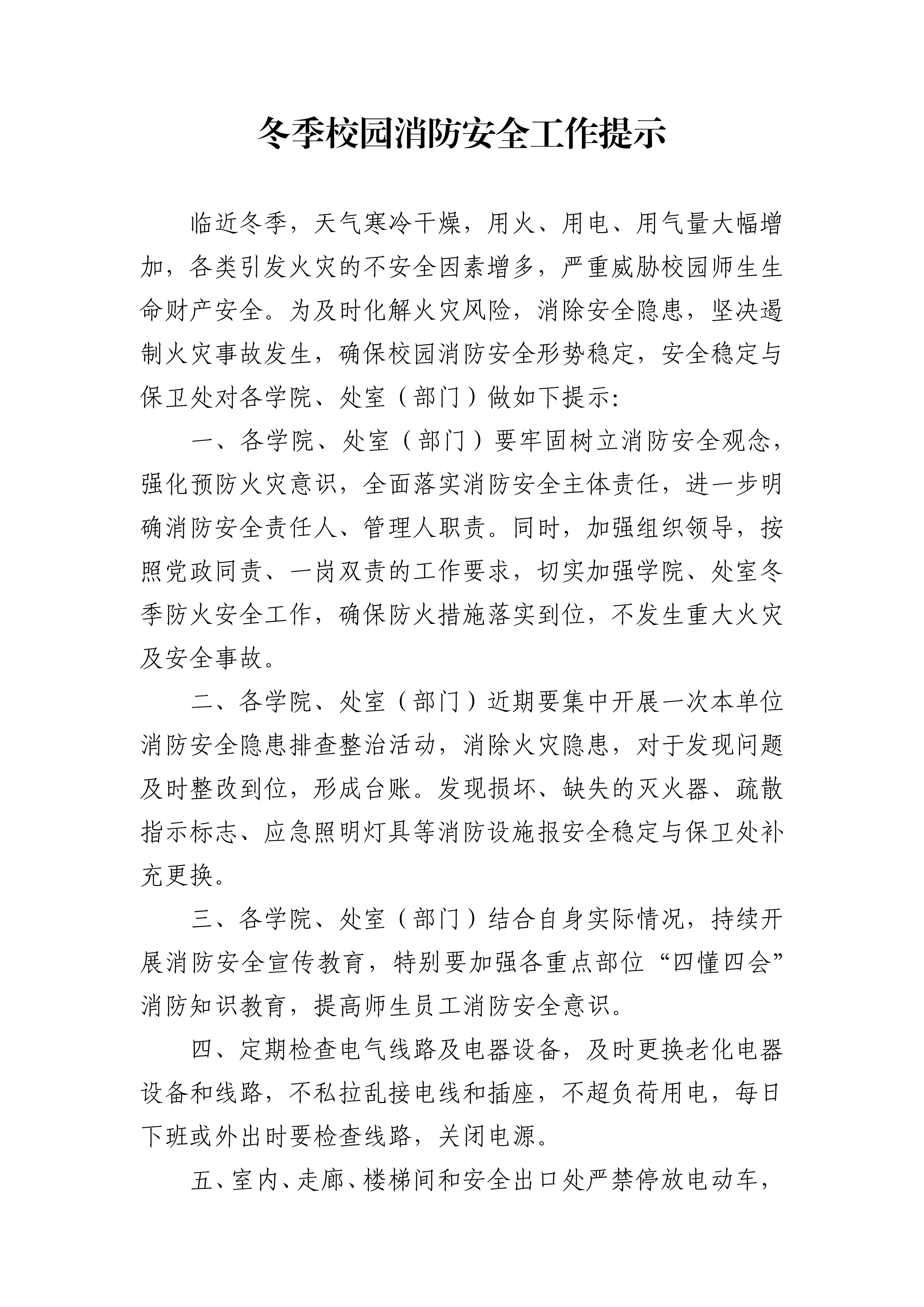 冬季校园消防安全工作提示
