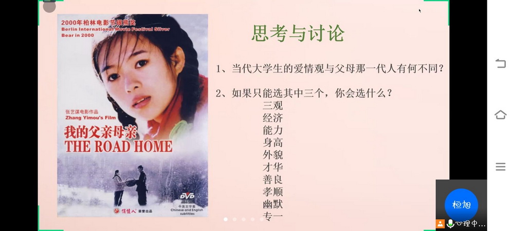 3月17日晚,心理健康教育中心组织开展线上电影赏析,共计700余学生在心理健康教育中心的教师团队引领下,从心理学的角度出发,现场解读了《心灵奇旅》《怦然心动》《憨豆先生之大灾难》《我的父亲母亲》《青春变形记》五部佳片。
