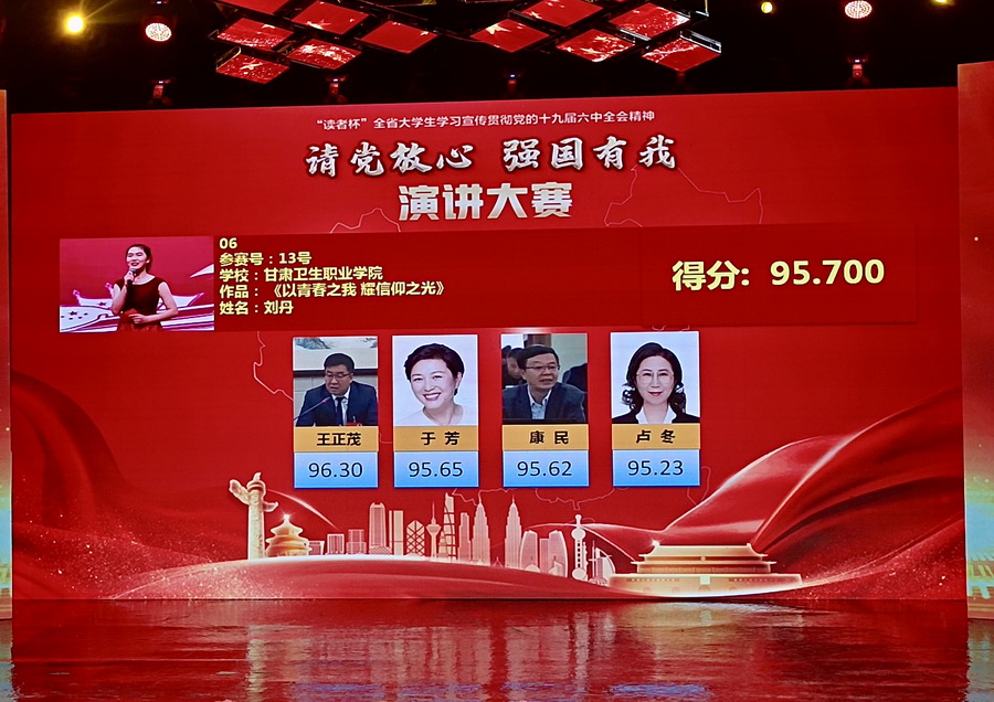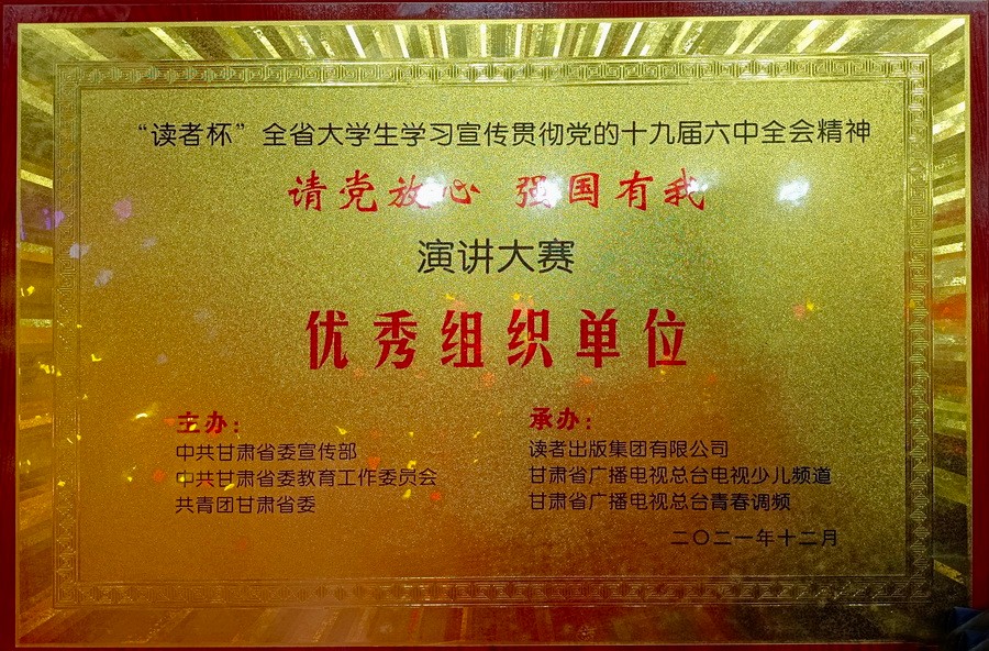 为了教育引导全省高校青年学生学习宣传贯彻党的十九届六中全会精神,营造浓厚舆论氛围,开展广泛而生动的基层宣讲,由省委宣传部、省委教育工委、团省委主办,读者出版集团有限公司、甘肃省广播电视总台电视少儿频道、总台青春调频承办的“读者杯”全省大学生学习宣传贯彻党的十九届六中全会精神“请党放心 强国有我”演讲大赛决赛于12月28日至29日在甘肃省广播电视总台演播大厅进行,来自全省高校的50件作品进入了现场决赛。最终,由校团委选送、威廉希尔官网选手刘丹同学演讲的作品《以青春之我 耀信仰之光》获大赛二等奖,同时威廉希尔官网获大赛优秀组织奖。