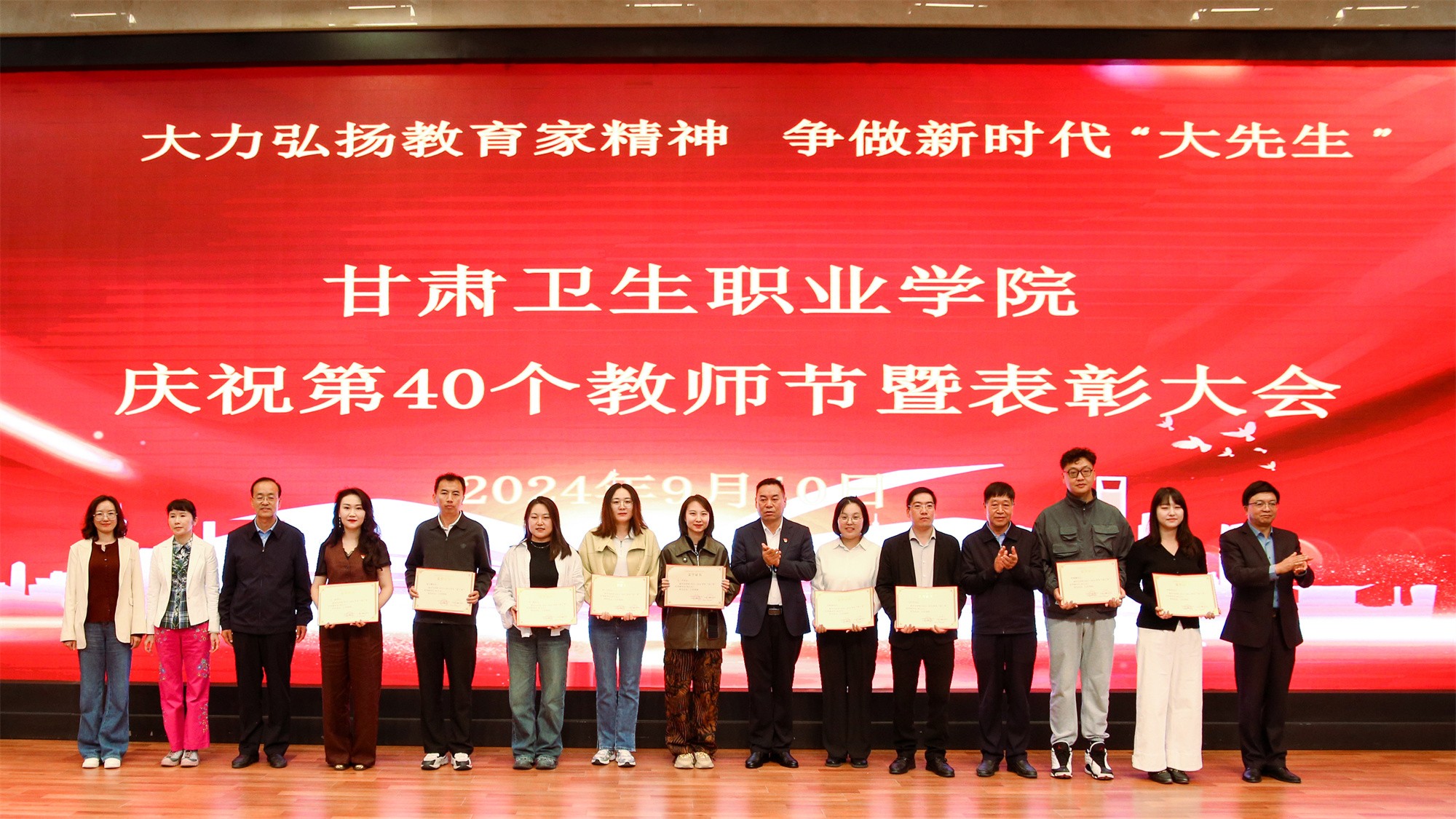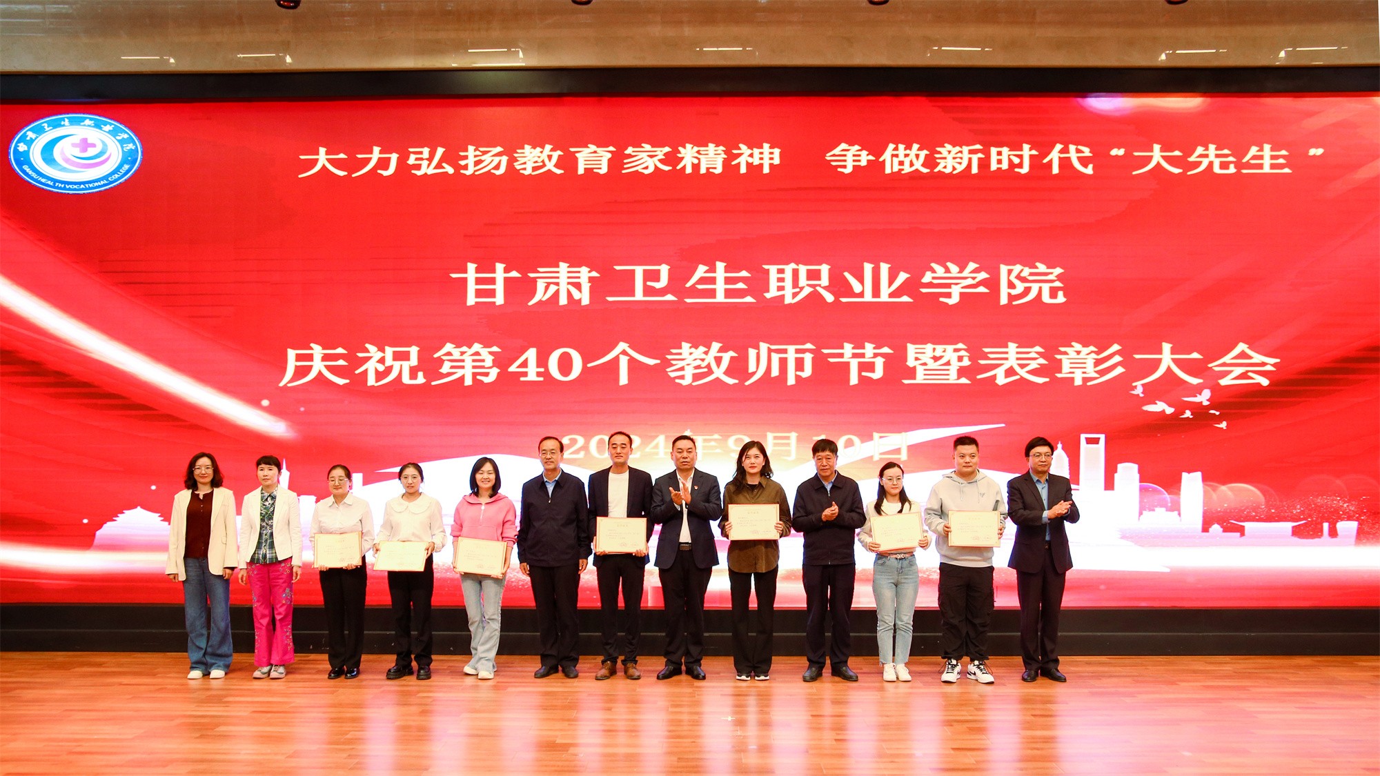 最后,党委书记包磊代表学校党委向默默耕耘、无私奉献的广大教职员工致以节日的问候和崇高的敬意,向受到表彰的先进集体和个人表示热烈祝贺。他赞扬了新入职教师的激情和决心,肯定了在职教师的奉献和成就,以及退休教师的贡献和精神。包磊指出,卫职院因医而名、因医而荣、因师而兴。学校发展正面临着新形势、新阶段、新目标、新要求,面对新的发展机遇,学校正以“锐意改革、矢志跨越”的责任使命和敢于担当的勇气,坚持把教师作为学校发展第一资源,努力形成广大教师尽展其才、高素质专业化创新型教师队伍不断涌现的良好局面。他提出了几点希望与老师们共勉:一是胸怀红色印记,做永远跟党走的教师;二是涵养高尚师德,铺就最美职业底色;三是大兴笃学之风,锤炼高超娴熟师艺;四是紧扣时代脉搏,不断提高新质素养。最后,他表示学校今后将始终坚守教师为立校之本、兴校之源这一本质,大力弘扬尊师重教风尚,用心用情用力做好教师管理服务和培训培养工作,让广大教师安心从教、热心从教、舒心从教。