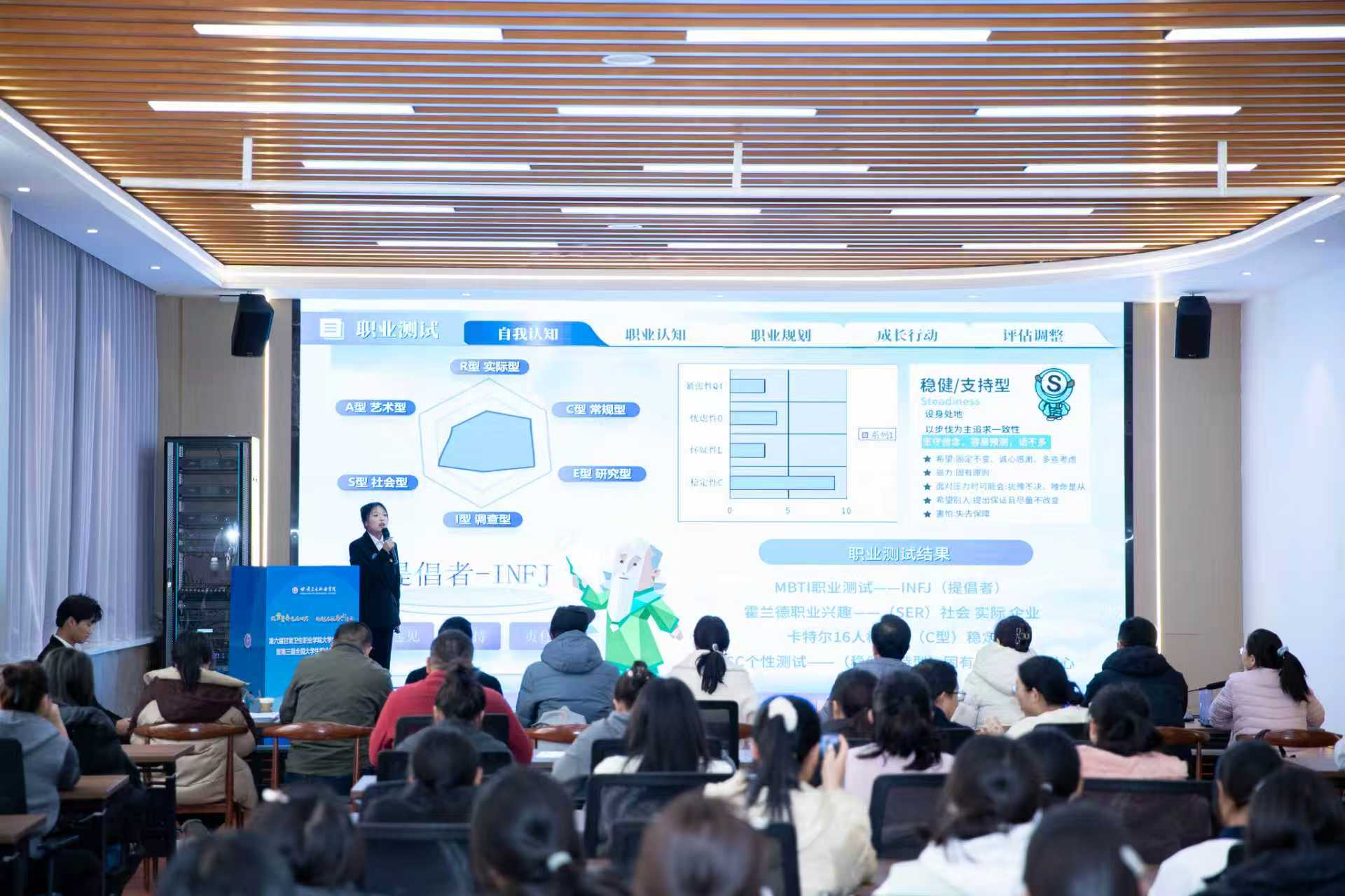 为了让赛事更具实效,赛前依托2025年普通高校公共就业创业服务能力提升省级示范项目,组织就业工作人员、课程教师及辅导员参加职业规划大赛指导能力提升培训;特邀多项国家级赛事获奖指导教师张洗玉教授为学生指导备赛技巧。二级学院赛中,各学院通过比赛选拔、专题辅导等形式,让职业规划与岗位需求深度贴合,帮助选手把“纸上蓝图”转化为“可行方案”。