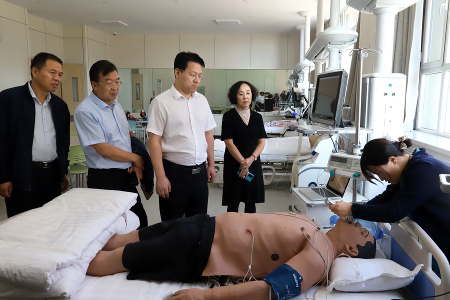 金阿宁主任一行先后参观了学校信息中心的创新数字医学中心平板课堂、模拟医院和执业医师资格证考试考场,考察了中医药学院中医实训中心、针灸推拿实训中心和药学实训中心的建设情况,观摩了临床护理学院老年护理模拟实训中心、ICU实训中心和OSCE考站运行情况,听取了各实验实训中心负责人的讲解汇报。