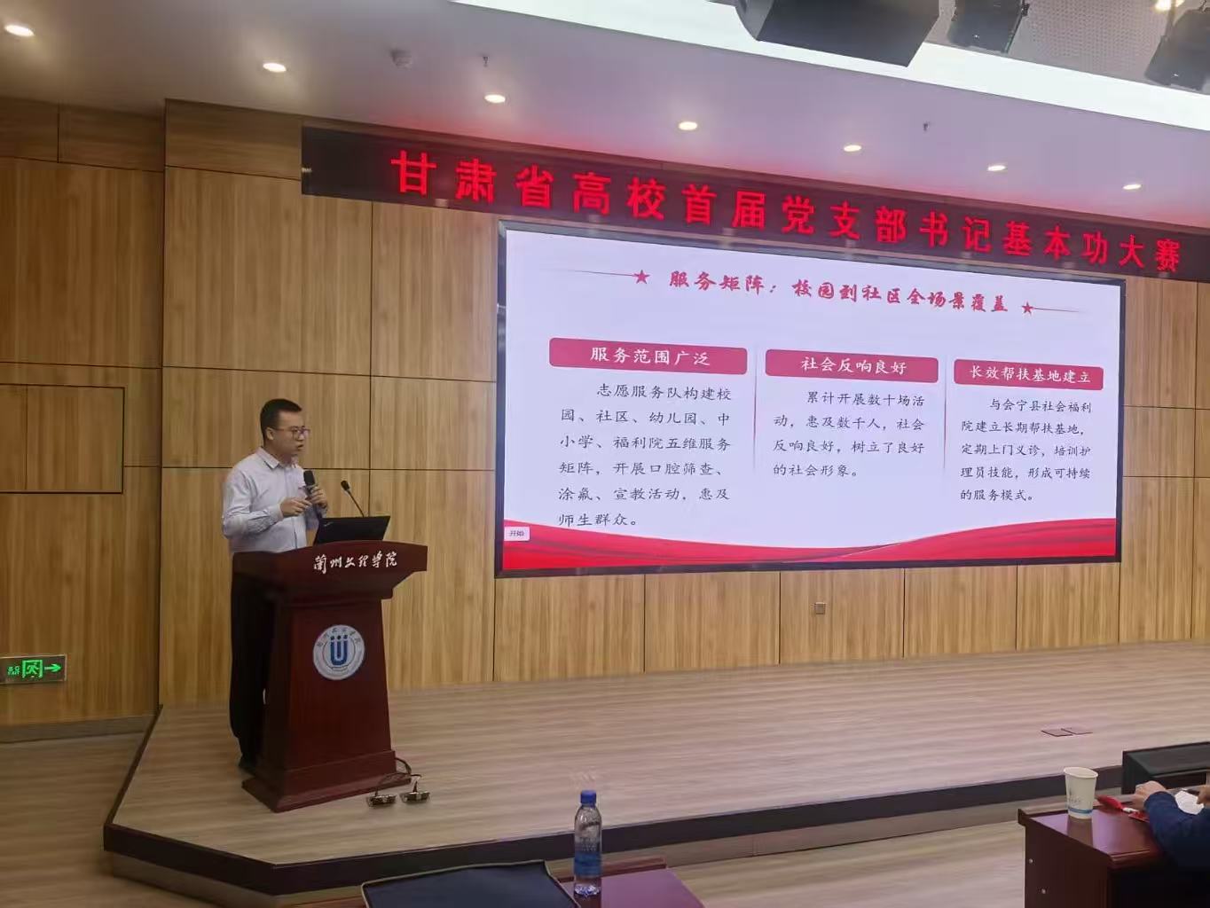 近日,甘肃省高校首届党支部书记基本功大赛在兰州文理学院举行,来自全省高校的46名党支部书记参加比赛。比赛设置基础知识测试、谈心谈话情景模拟、特色案例展示三个环节,全面考察参赛选手的政治素养、理论功底和履职能力。学院口腔医学院学生党支部书记刘国强,凭借扎实的理论功底和过硬的专业素养在全体参赛选手中总成绩排第13名,荣获大赛三等奖。