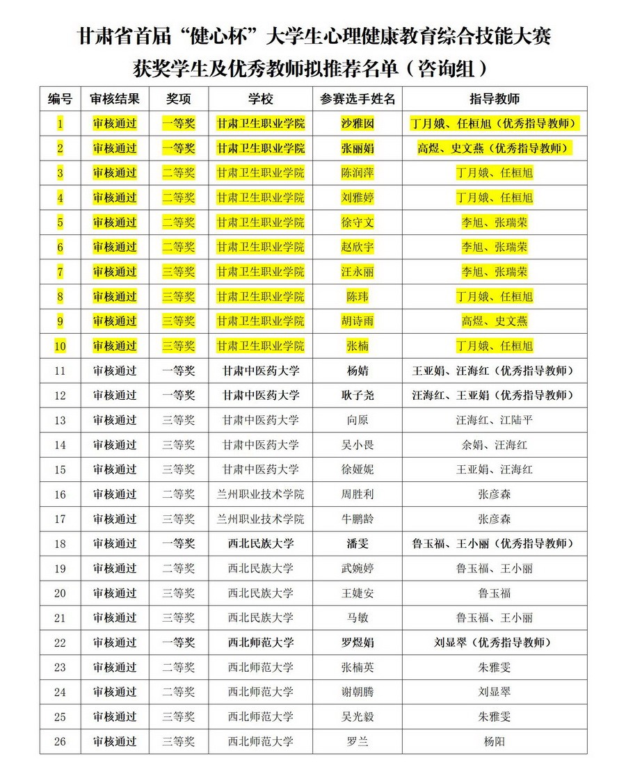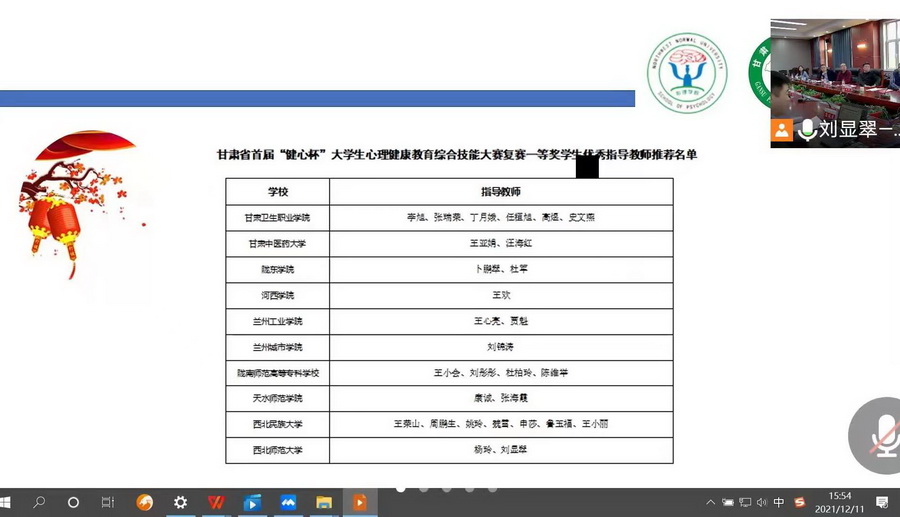 12月11日,由由甘肃省教育厅主办、西北师范大学心理学院和甘肃省心理学会联合承办的甘肃省首届大学生“健心杯”心理健康教育综合技能大赛落下帷幕,比赛结果、优秀指导教师及优秀组织单位的拟推荐名单公示10日,现已审核通过,威廉希尔官网参赛团队在本次活动中取得了佳绩。