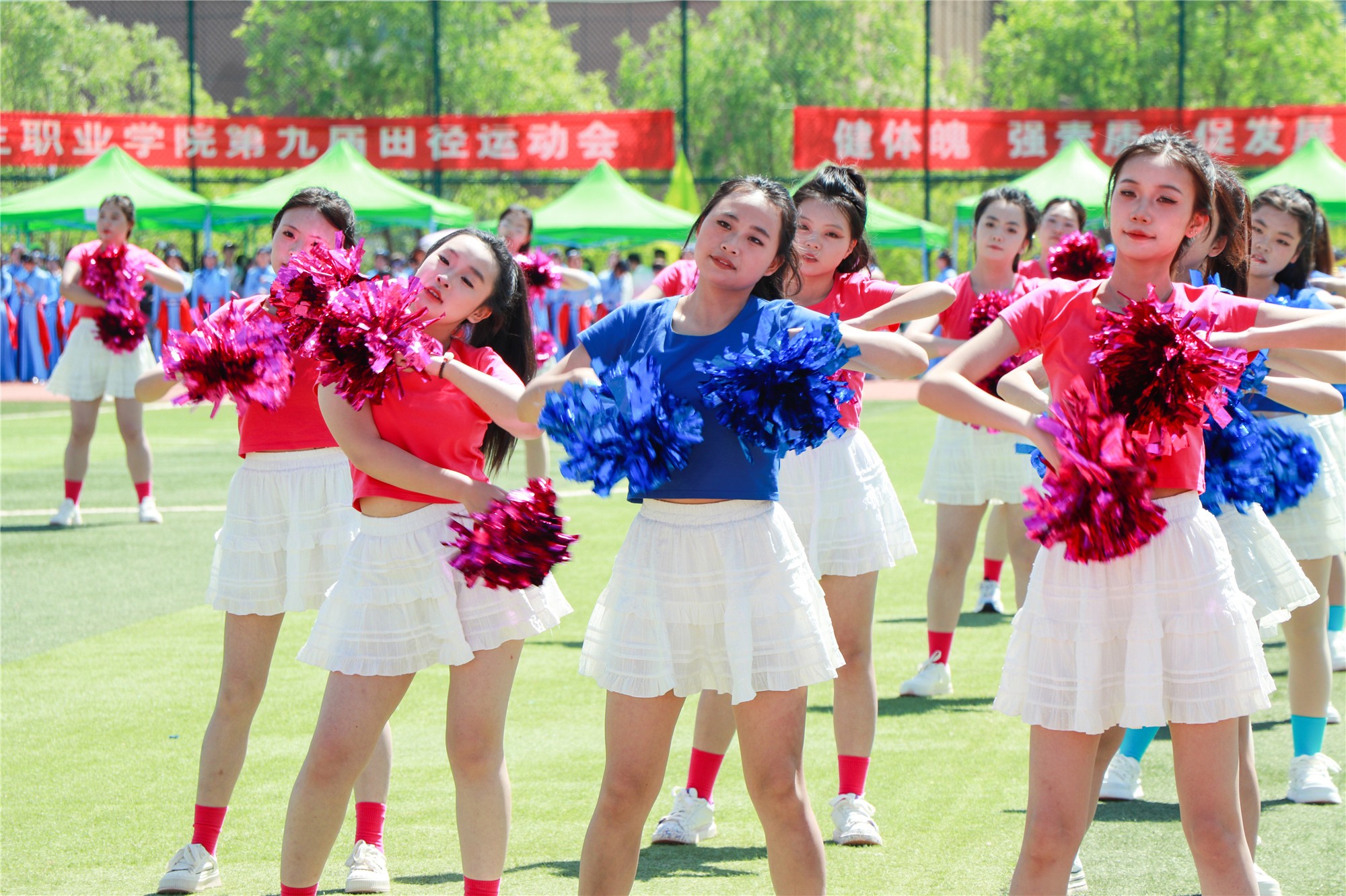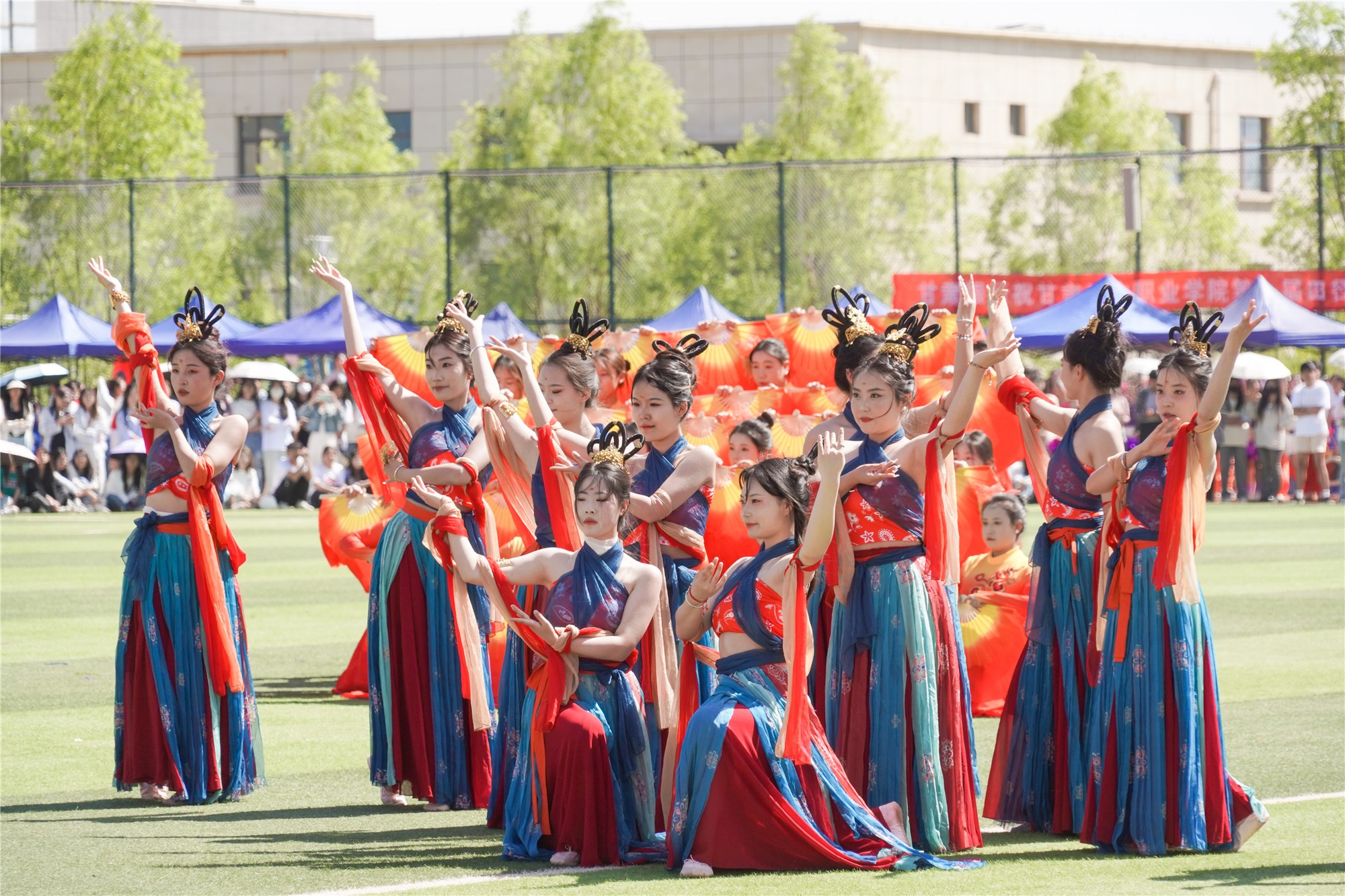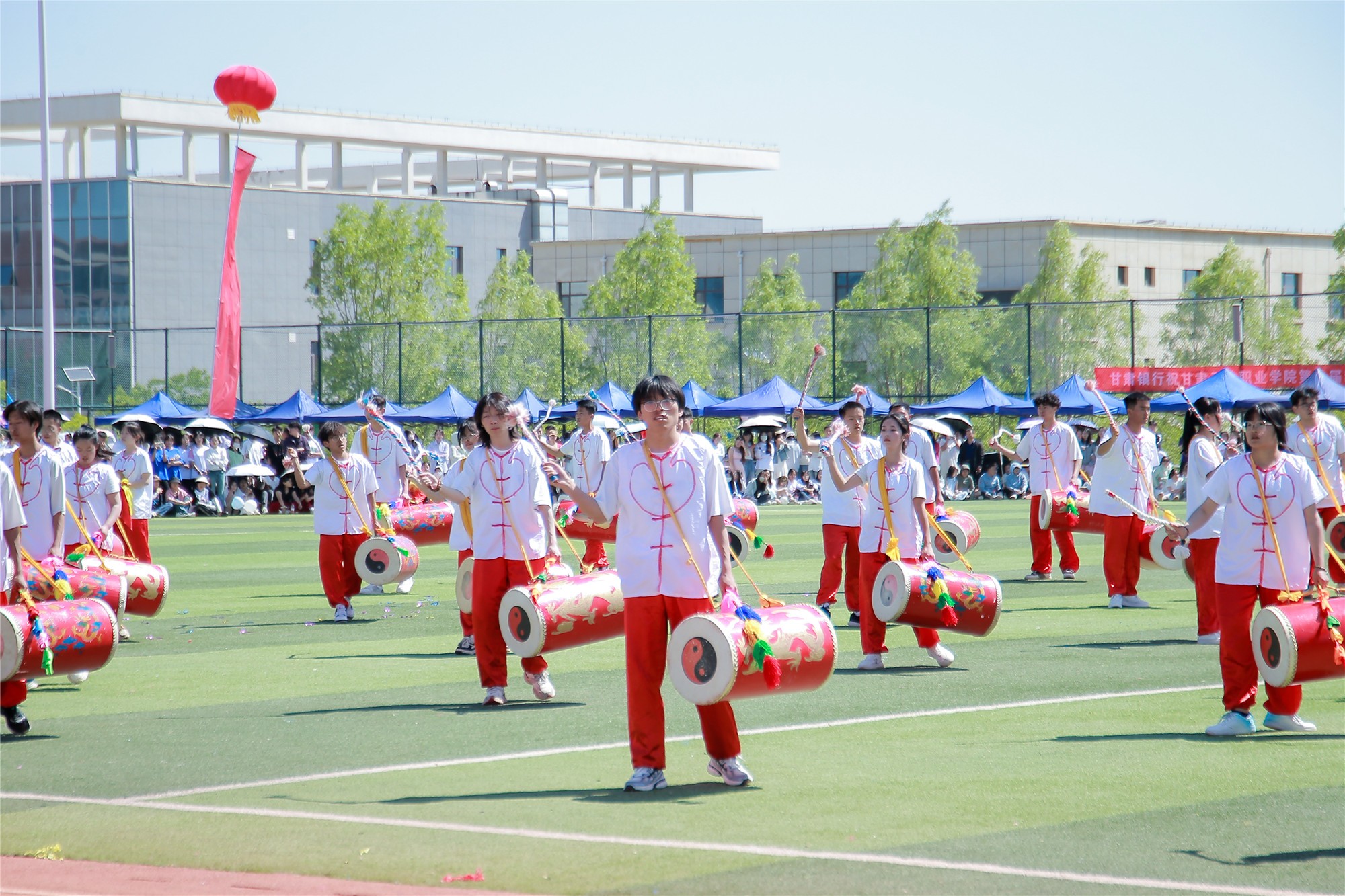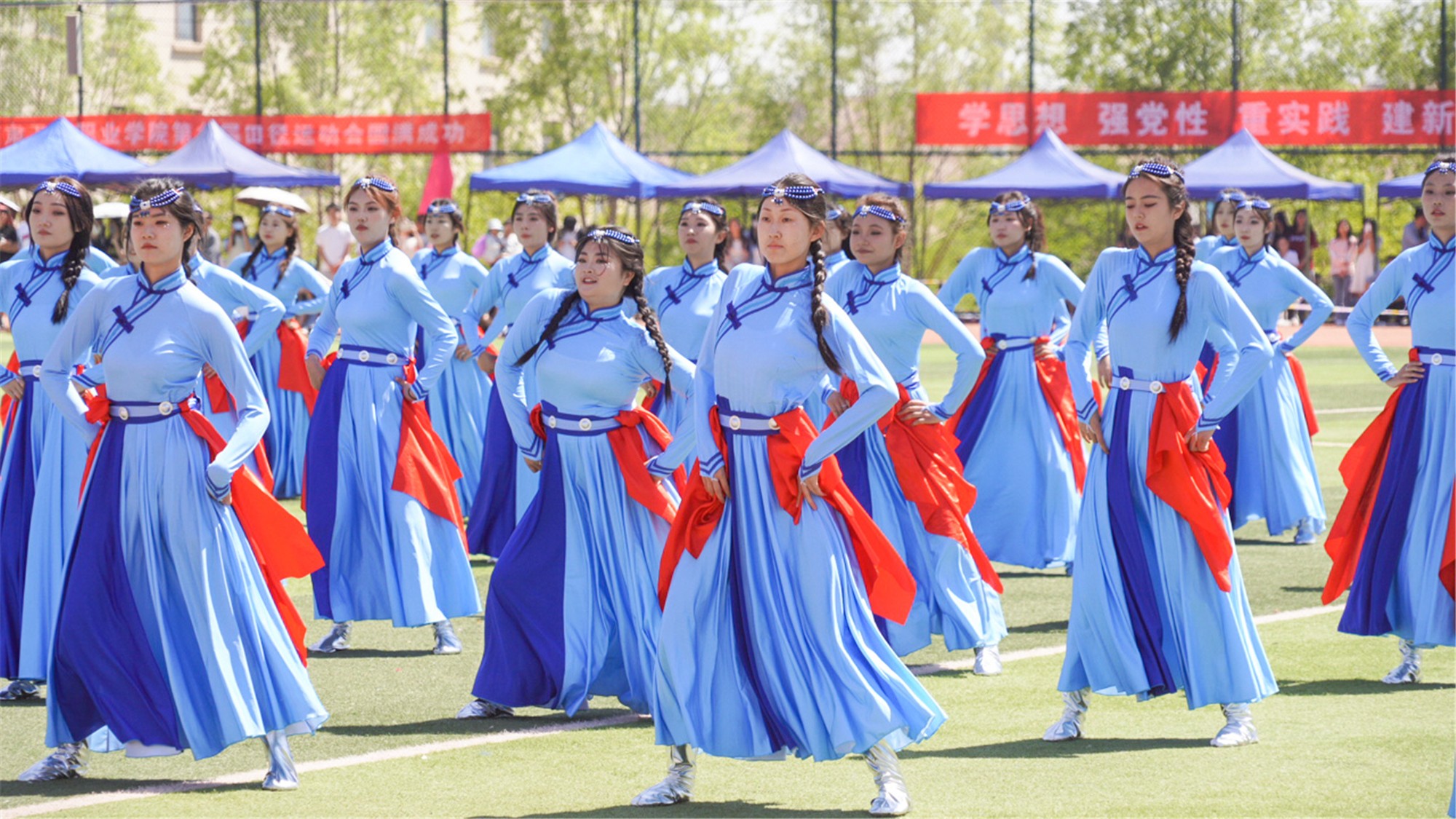各方队退场后,校团委和各二级学院进行了精彩的节目表演。《春满九州》带来充满无限春意的开场,《龙狮共舞耀中华》中舞龙舞狮伴随着鼓点欢腾舞动,振奋人心,《铿锵鼓乐展英姿》展现了国家非遗文化的传承与弘扬,《我们的未来式》用充满活力的青春舞姿表达了同学们对未来的美好憧憬,最后蒙古舞表演《特斯河之赞》以舞蹈为载体,带领师生体验民族风情,赢得现场叫好连连。