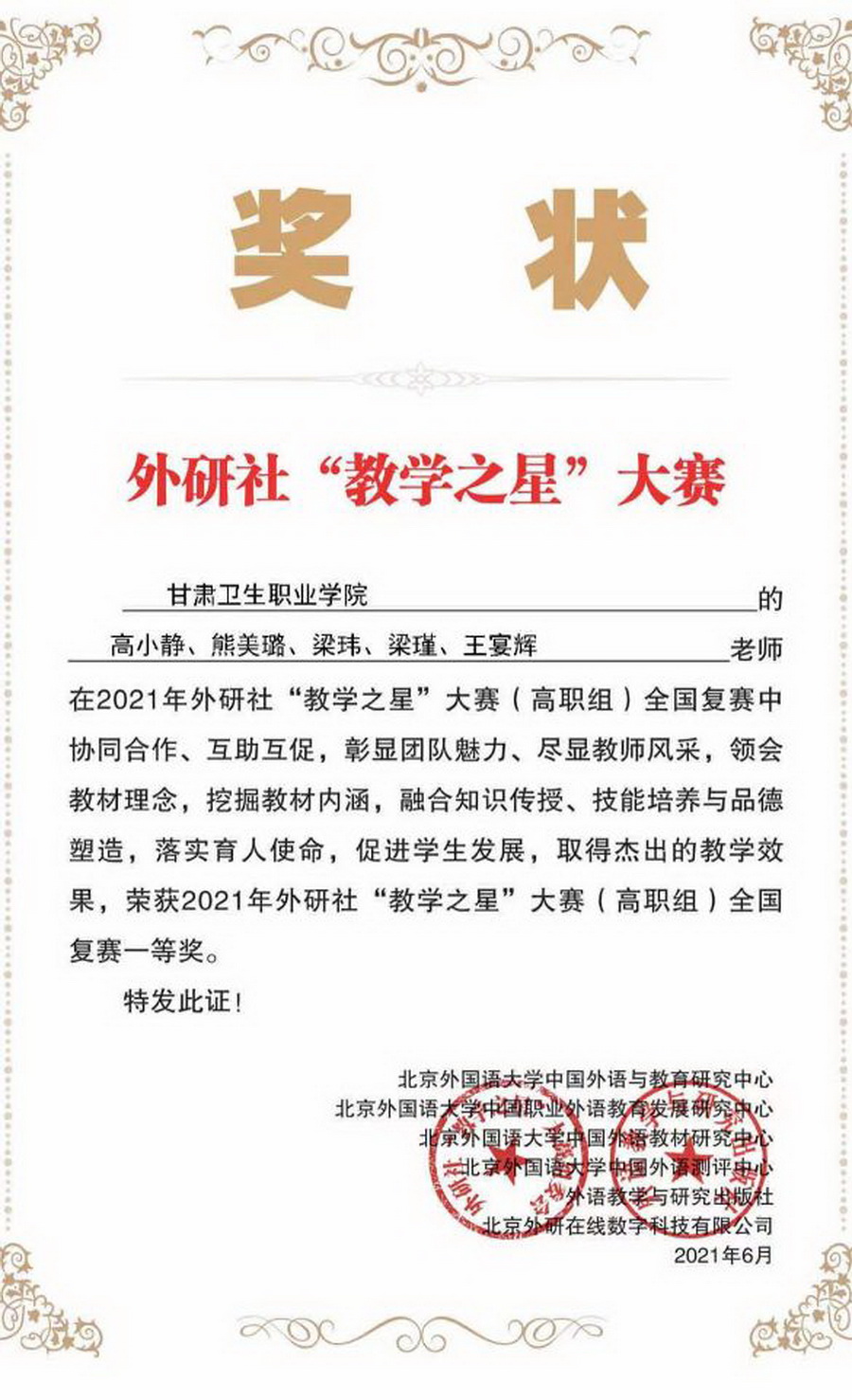 威廉希尔中文网站英语教师团队荣获2021年外研社“教学之星”大赛(高职组)全国复赛一等奖发布时间:2021-09-09 -