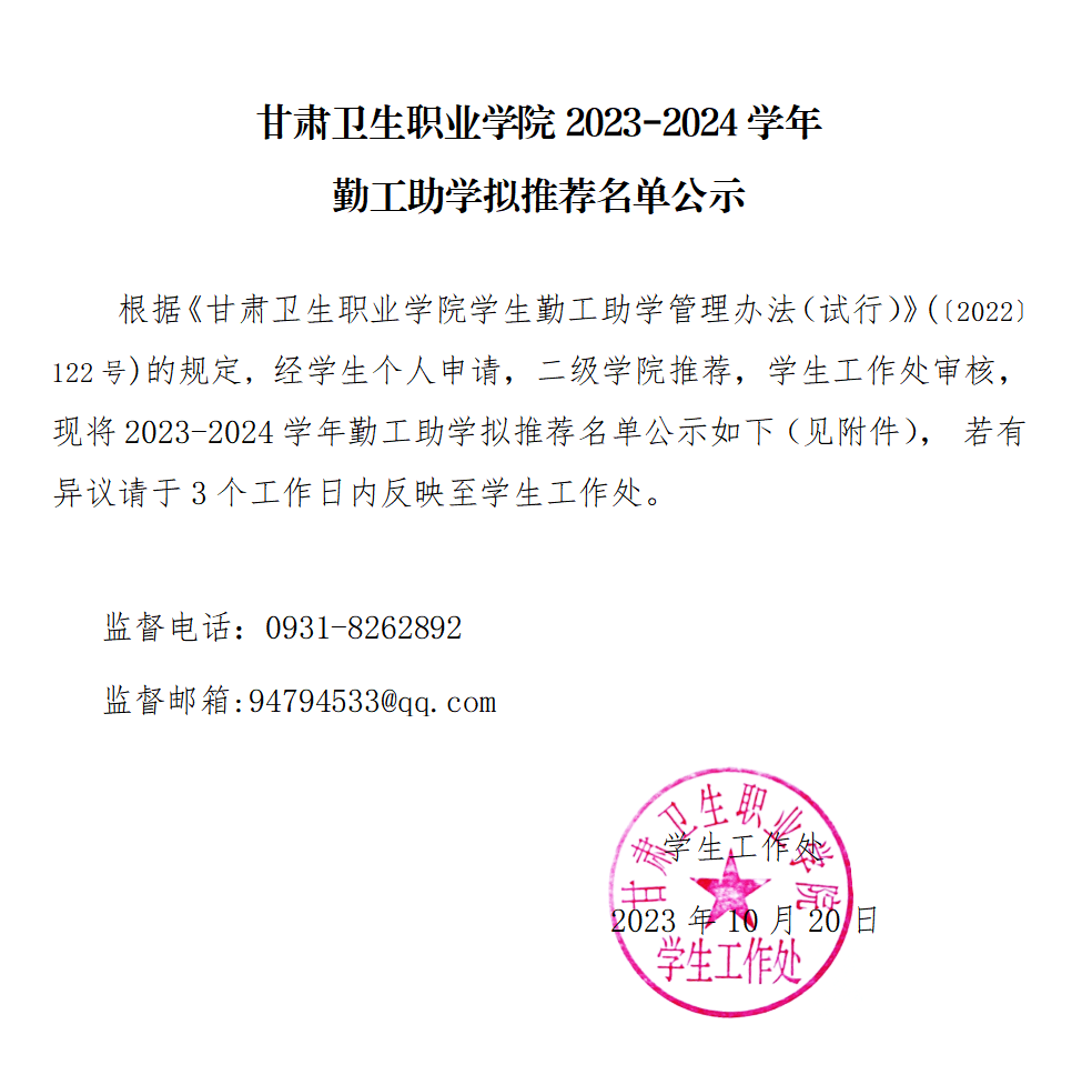 威廉希尔中文网站2023-2024学年勤工助学拟推荐名单公示发布时间:2023-10-20 -