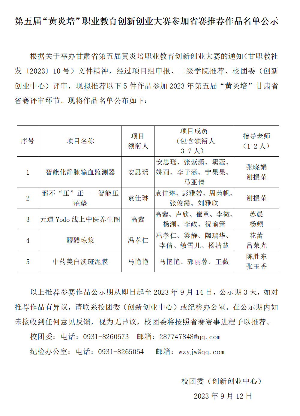 第五届“黄炎培”职业教育创新创业大赛参加省赛推荐作品名单公示发布时间:2023-09-12 -