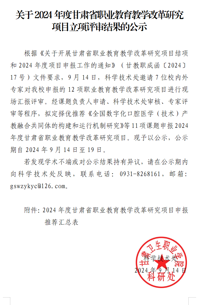 关于2024年度甘肃省职业教育教学改革研究项目结项评审结果的公示发布时间:2024-09-04